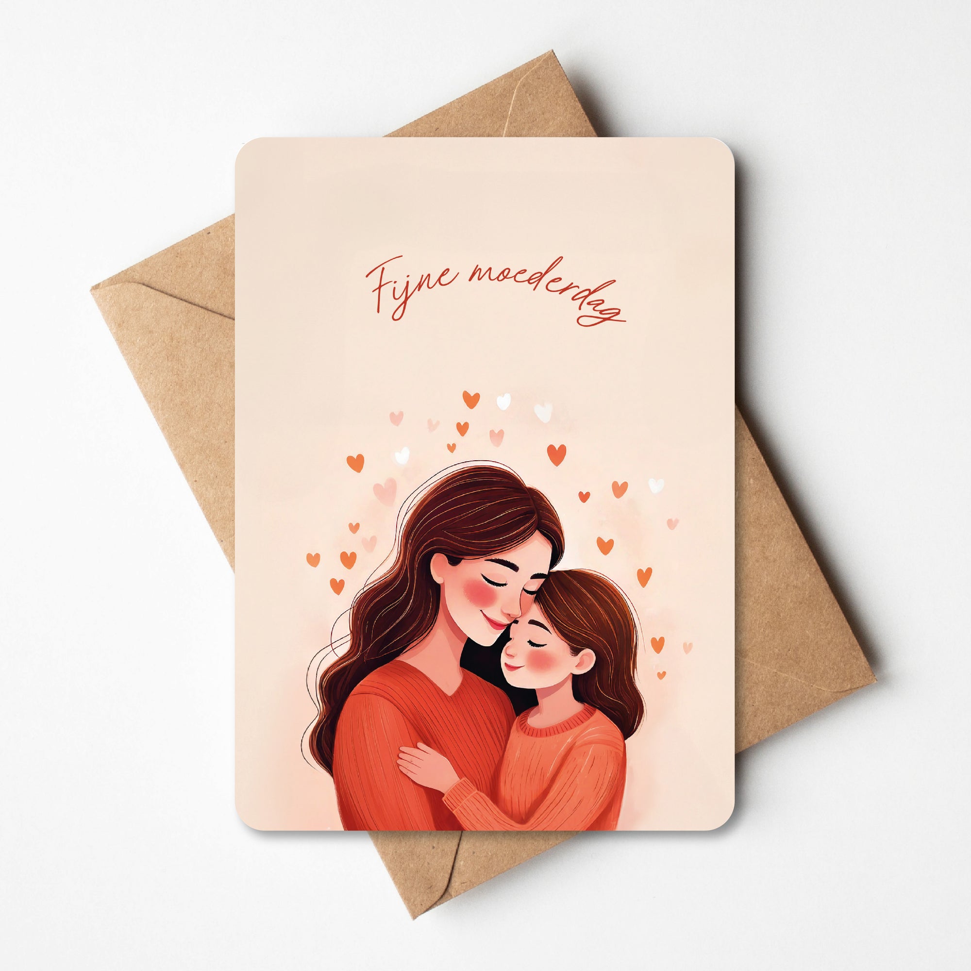 Een hartverwarmende Moederdagkaart met een illustratie van een knuffel tussen mama en dochter. De perfecte manier om jouw liefde en dankbaarheid te tonen. Beschikbaar bij Buro Allure.